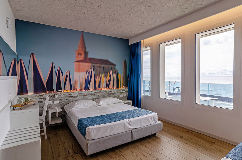 Die Classic Doppelzimmer mit schöner Terrasse zum Meer laden Sie mit einem einzigartigen Panorama zum Verweilen ein. Genießen Sie einen erholsamen Aufenthalt im Hotel Negretto in Caorle – nur wenige Schritte vom Strand entfernt.