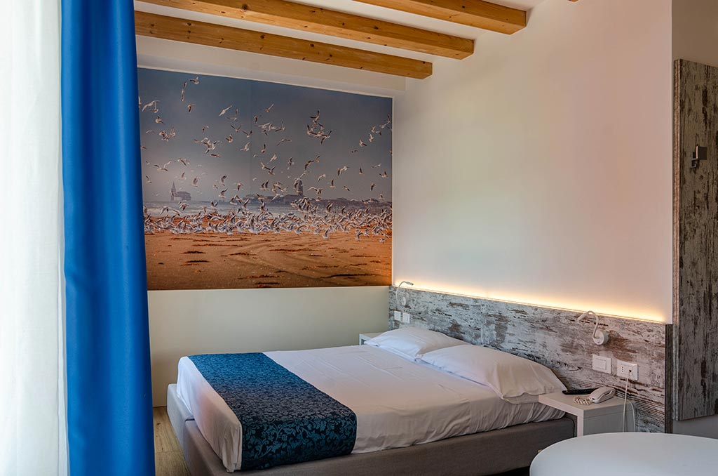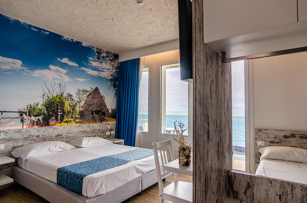 The Classic Double Rooms with a beautiful sea-facing terrace welcome you with a unique panoramic view. Enjoy a relaxing stay at Hotel Negretto in Caorle, just steps from the beach.